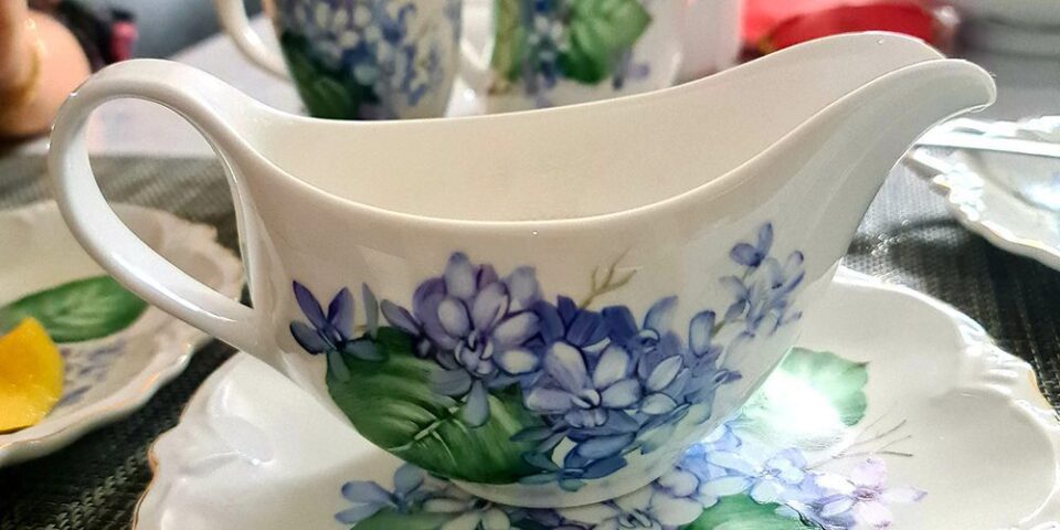 Begitulah cerita saya, sesedap pulut digaul dengan kuah durian Musang King, bertambah sedap bila ia dihidang dalam bekas yang terlalu elegan, yang dilukis oleh jejari teman sendiri. Teman yang sudah sekian lama mengabdikan diri pada seni ‘porcelain painting’. Saat dia gembira dia membawa dirinya larut dalam ilham karya agungnya itu. Saat dia berduka (baru sahaja kehilangan suami tercinta, Almarhum Dato Tunku Kamil Ikram Tunku Abdullah), dia melepaskan rindu dan kepiluan hatinya dengan melukis, dan hanya dia sahaja yang faham kisah di sebalik lukisan bunga-bunga yang mengindahi set pinggan mangkuknya itu.